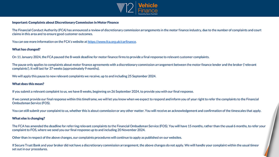 If Secure Trust Bank and your broker did not have a discretionary commission arrangement. In that case, the above changes do not apply, and we will handle your complaint within the